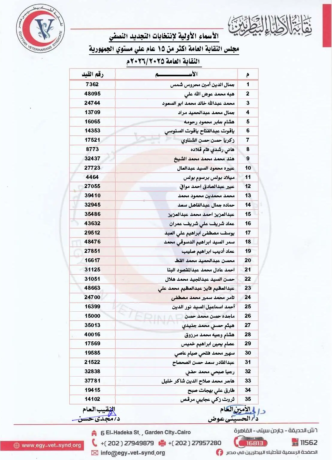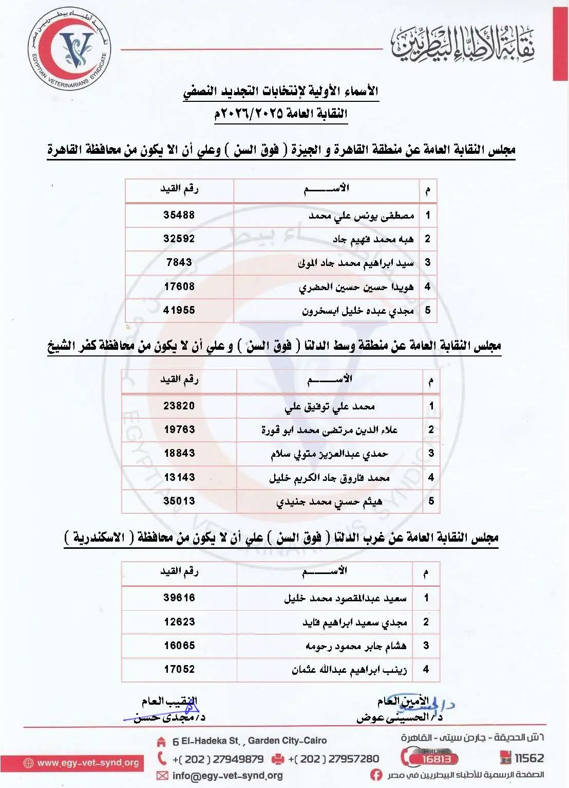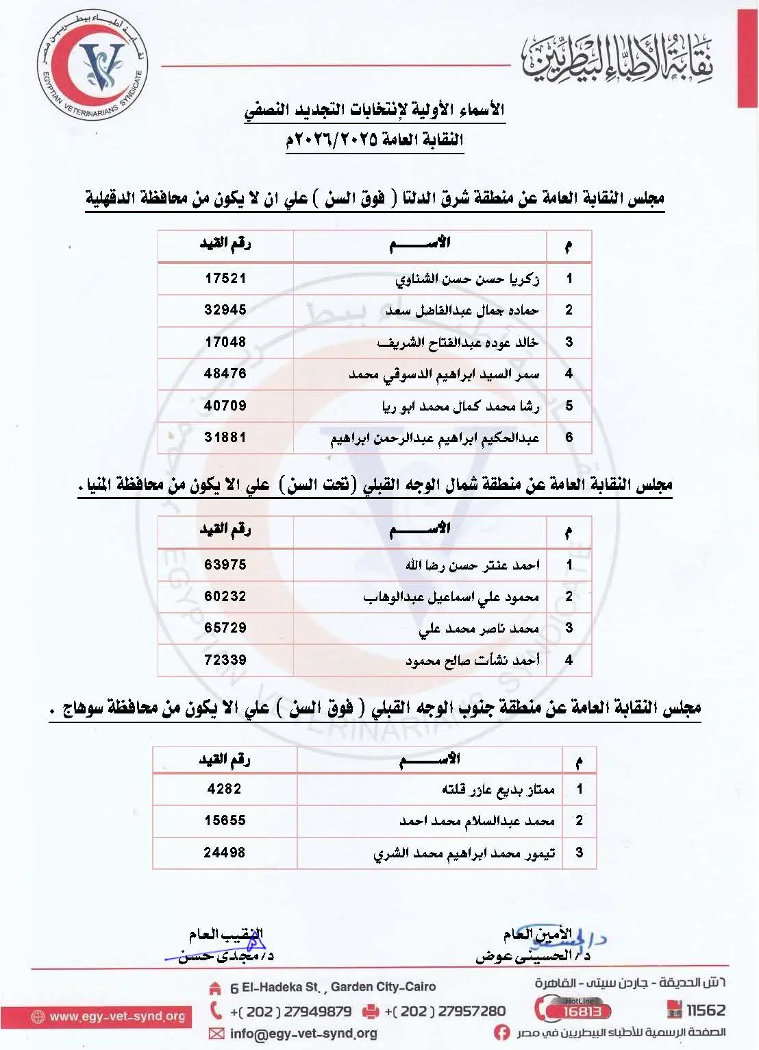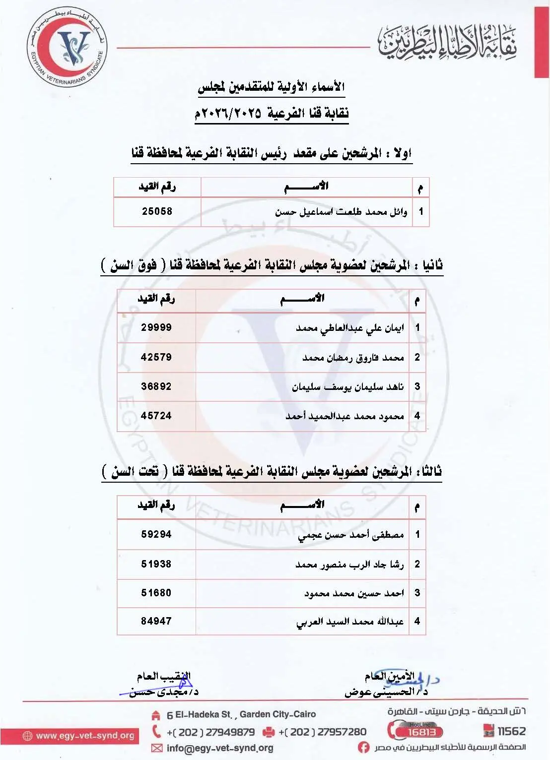 تعلن النقابة العامة للأطباء البيطريين عن الكشوف الأولية للمرشحين بانتخابات التجديد النصفي للنقابة العامة للأطباء البيطريين ومجلس النقابة الفرعية بقنا.
