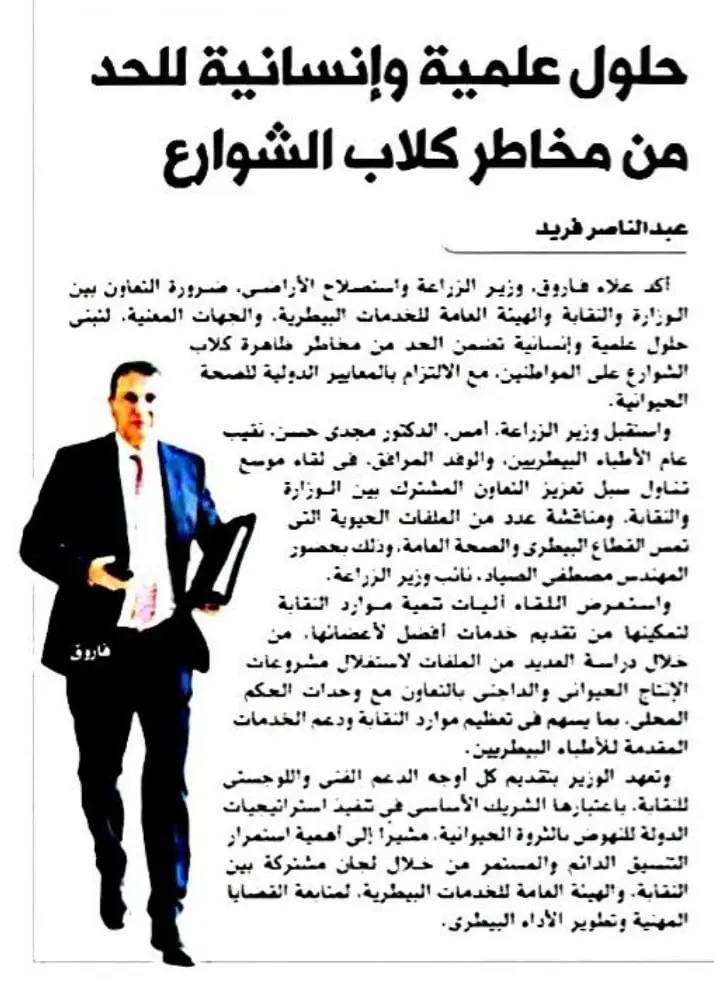 بعدد جريدة الدستور الصادر اليوم السبت الموافق ٢٧ ديسمبر ٢٠٢٥، لقاء وزير الزراعة لنقيب عام الأطباء البيطريين، والبحث عن حلول لظاهرة "كلاب الشوارع".