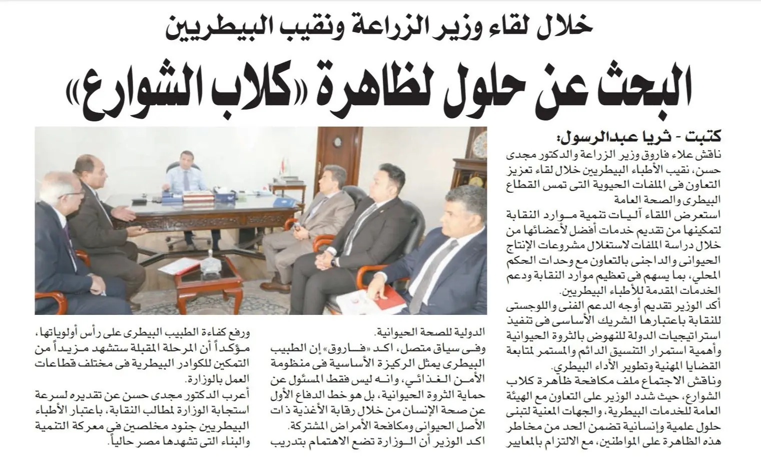 بعدد جريدة الجمهورية الصادر اليوم السبت الموافق ٢٧ ديسمبر ٢٠٢٥، لقاء وزير الزراعة لنقيب عام الأطباء البيطريين، والبحث عن حلول لظاهرة "كلاب الشوارع".