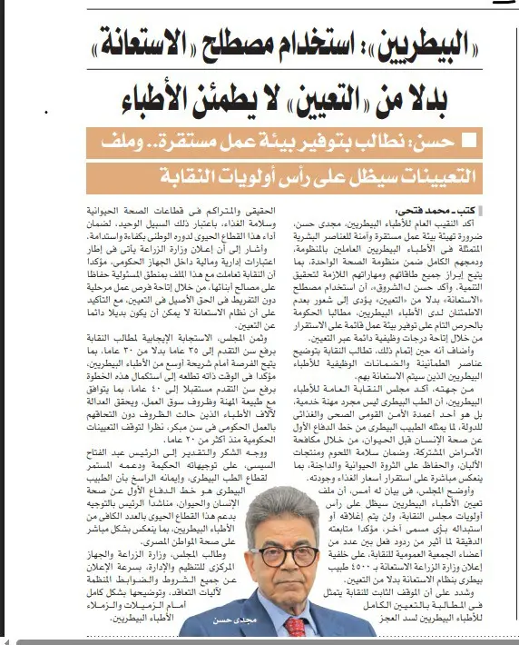 وشدد على أن الموقف الثابت للنقابة يتمثل فى المطالبة بالتعيين الكامل للأطباء البيطريين لسد العجز الحقيقى والمتراكم فى قطاعات الصحة الحيوانية وسلامة الغذاء، باعتبار ذلك السبيل الوحيد، لضمان أداء هذا القطاع الحيوى لدوره الوطنى بكفاءة واستدامة.