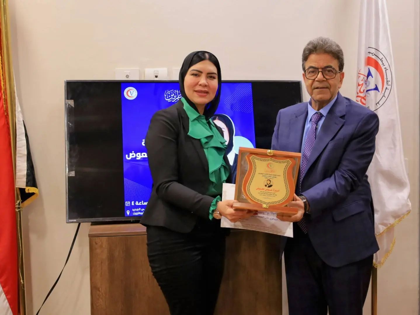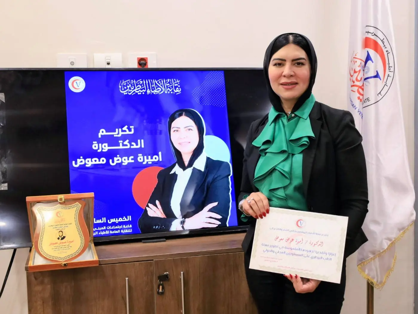 تقديرا لجهودها على المستويين المحلي والدولي في مهنة الطب البيطري، وذلك بحضور عدد من أعضاء مجلس النقابة العامة للأطباء البيطريين، متمنين لسيادتها دوام التوفيق والتميز.