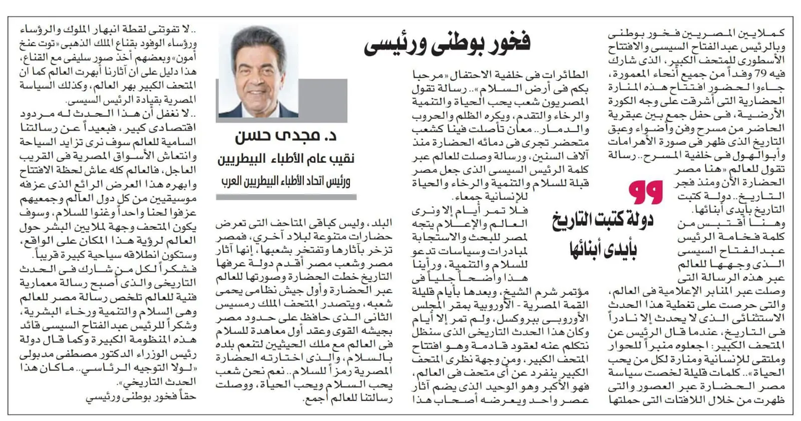 النقيب العام للأطباء البيطريين الدكتور/ مجدي حسن، يكتب في إطار مناسبة " افتتاح المتحف المصري الكبير"، " فخور بوطني ورئيسي"، بجريدة الجمهورية بعددها الصادر اليوم الأربعاء الموافق ٥ نوفمبر ٢٠٢٥.